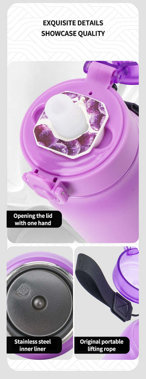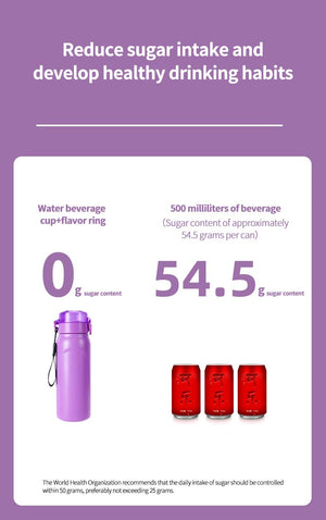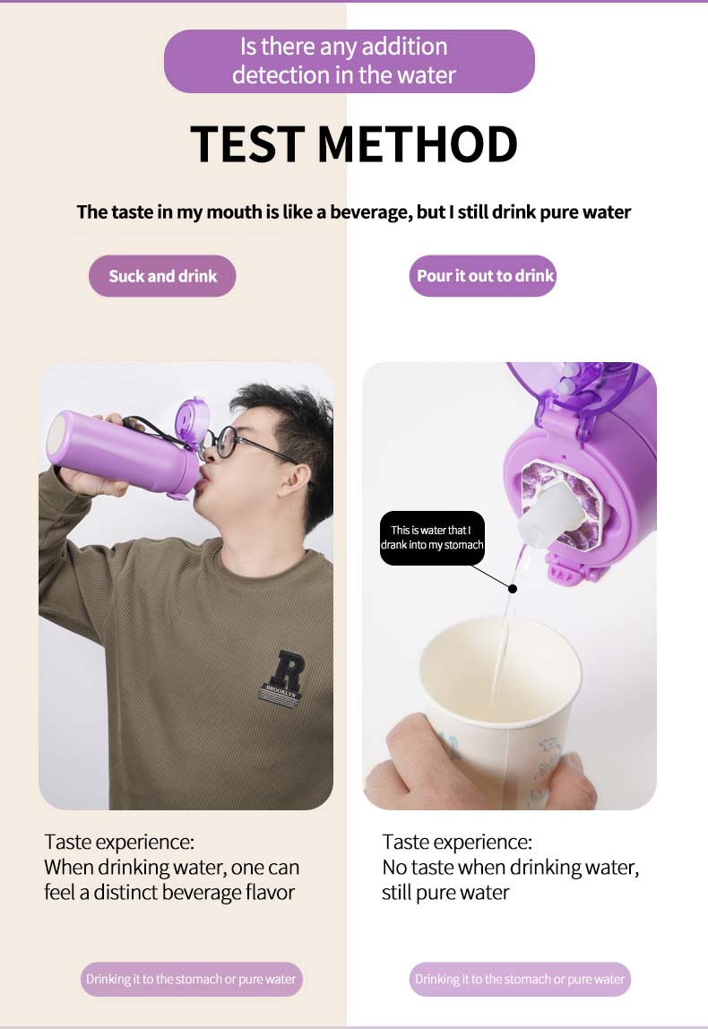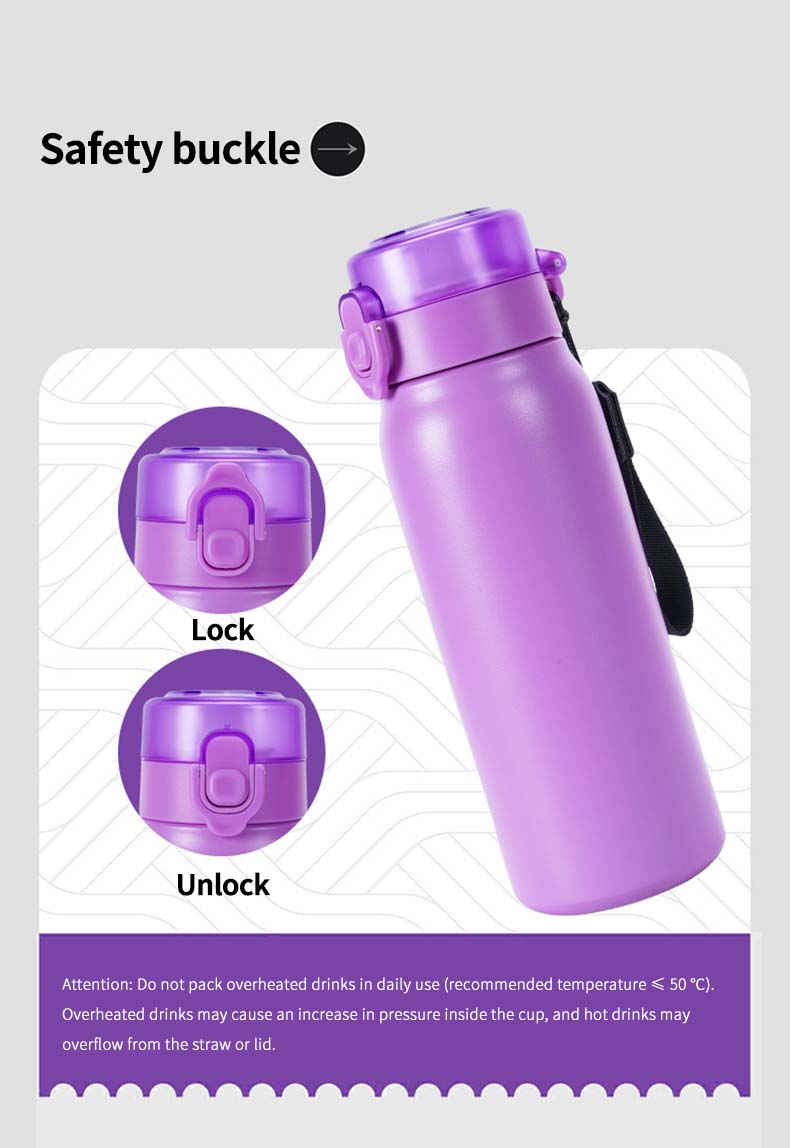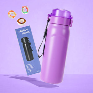 FlavorMist’s stainless-steel vacuum bottle uses 18/8 (304) double-wall vacuum insulation with a sealed flip-top lid to keep water cold for up to 24 hours (internal test: start at 4 °C, ~95% fill, 20 ± 2 °C ambient, lid closed). Attach a flavor pod and sip—no manual activation required. For best results, use cool or room-temperature still water; do not use hot liquids. All contact materials are food-grade—silicone nozzle, PP straw, and PP/TPE lid—and free from BPA, BPS, and phthalates. Actual cold retention varies with environment and usage.